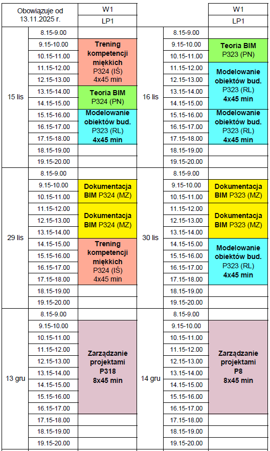 Zamieszczam rozkład zajęć na listopad i grudzień 2025 r. Niebawem zostanie on uzupełniony o zajęcia na styczeń i luty 2026 r.